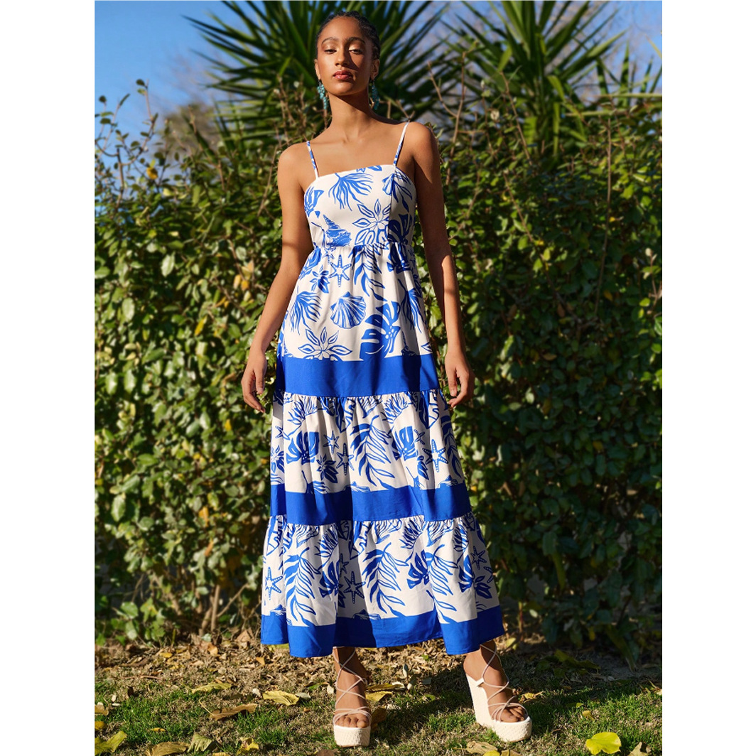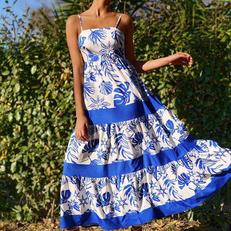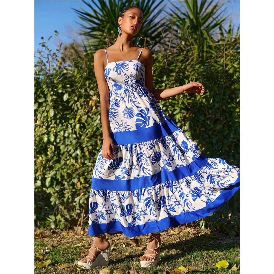 “Blue & White Floral Summer Dress – Boho Maxi Sundress for Beach & Resort”