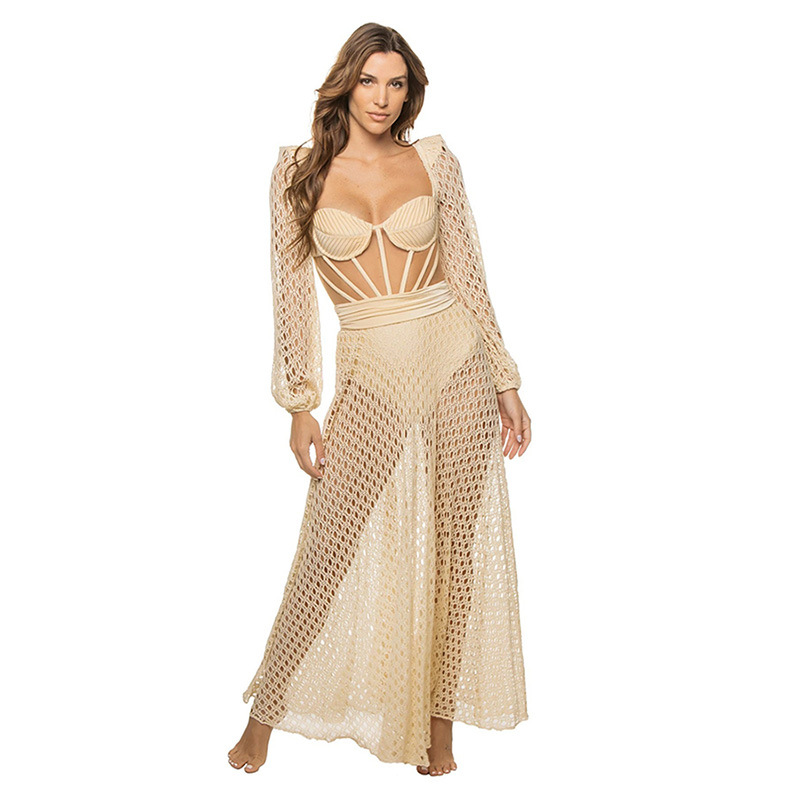 Boho Luxe Cutout Outfit – Elegant Long Sleeve Mesh Top & High Waist Skirt Set
